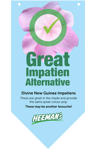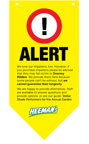 Adaptable Design – Various signs are needed as new plants are grown and environmental circumstances dictate. When downy mildew struck the impatien crop all over southwestern Ontario, Heeman’s was ready with alternative plants and Blue Aardvark was ready with informational signs …
